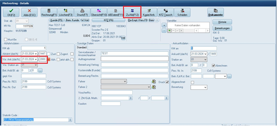 Wenn der Kunde ein Fahrzeug zurückmeldet, wird der Rückmeldezeitpunkt bzw. der vereinbarte Rückgabezeitpunkt im Feld „Vor. Ank. (dat/h)“ eingetragen.