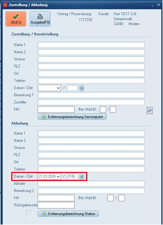 Im nächsten Schritt wird ein Abholzeitpunkt in der Zustellung-/Abholungsmaske gesetzt.