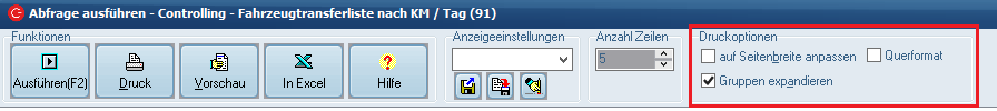 Hierzu stellt Ihnen das Abfragemodul diverse Einstellungen zur Verfügung. Diese finden Sie unter "Druckoptionen", Sie können auch die Liste zu Excel exportieren.