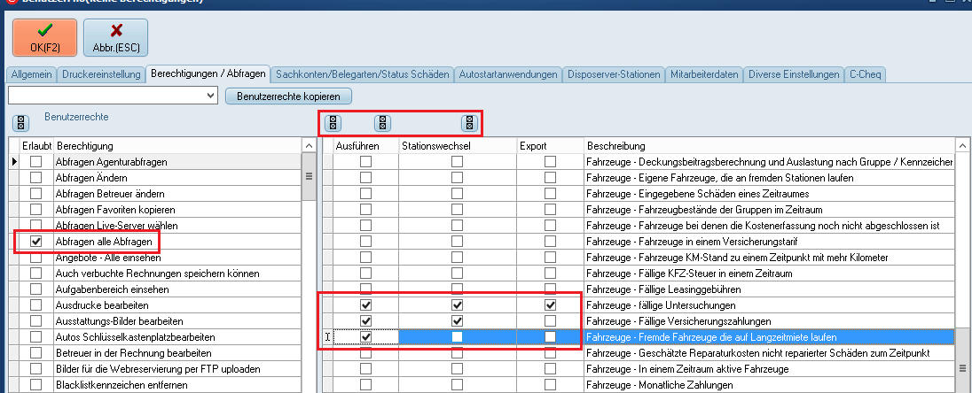 werden die darunterliegenden Spalten alle angehakt oder abgewählt. Ein Haken in der Spalte "Ausführen" berechtigt den User zum Ausführen dieser Abfrage. Ein Zusätzlicher Haken in der Spalte Stationswechsel erlaubt den Wechsel der Station innerhalb einer Abfrage. Die Spalte Export gibt den Button zum Export in Excel in der Abfrage frei.
