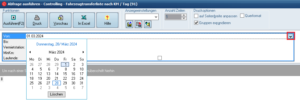 Um nun die Abfrage durchzuführen, müssen Sie den Zeitraum, für den diese gelten soll, definieren. Dies erreichen Sie durch Eingabe der Daten in die Felder "Von" und "Bis". Klicken Sie hierfür auf die entsprechende Zeile und danach auf das Dreieck-Symbol. Wählen Sie danach das Datum aus.