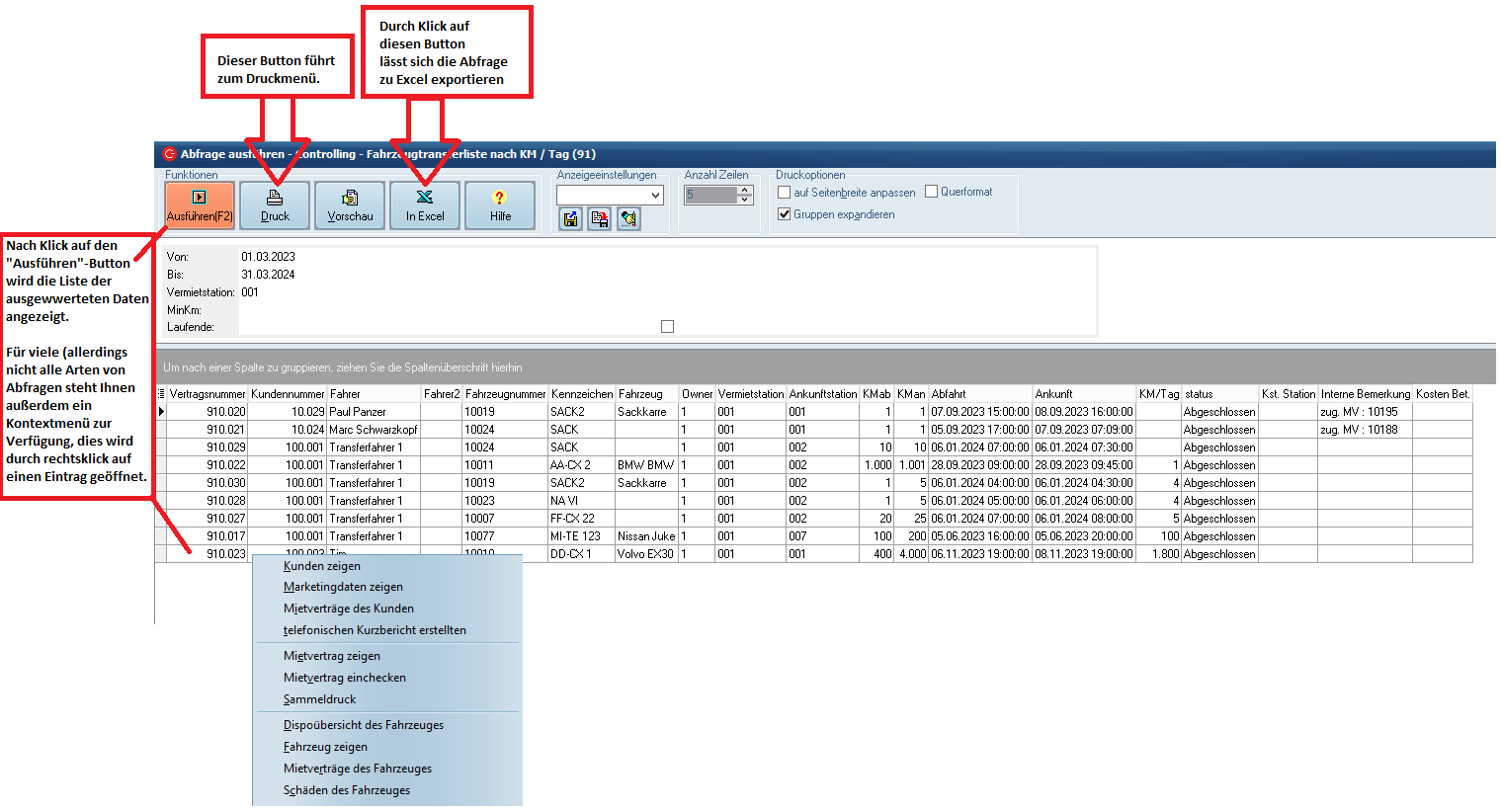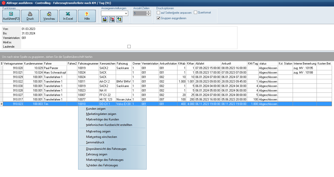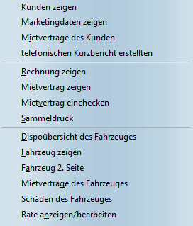 In diesem Fall könnten Sie so z.B. auf die Kundendaten zugreifen oder den zugehörigen Mietvertrag direkt einsehen, ohne den Umweg über die Dispo machen zu müssen. Hierbei ist allerdings anzumerken, das sich das Kontextmenü je nach Abfrage von diesem Beispiel unterscheiden kann oder auch gar nicht vorhanden ist.