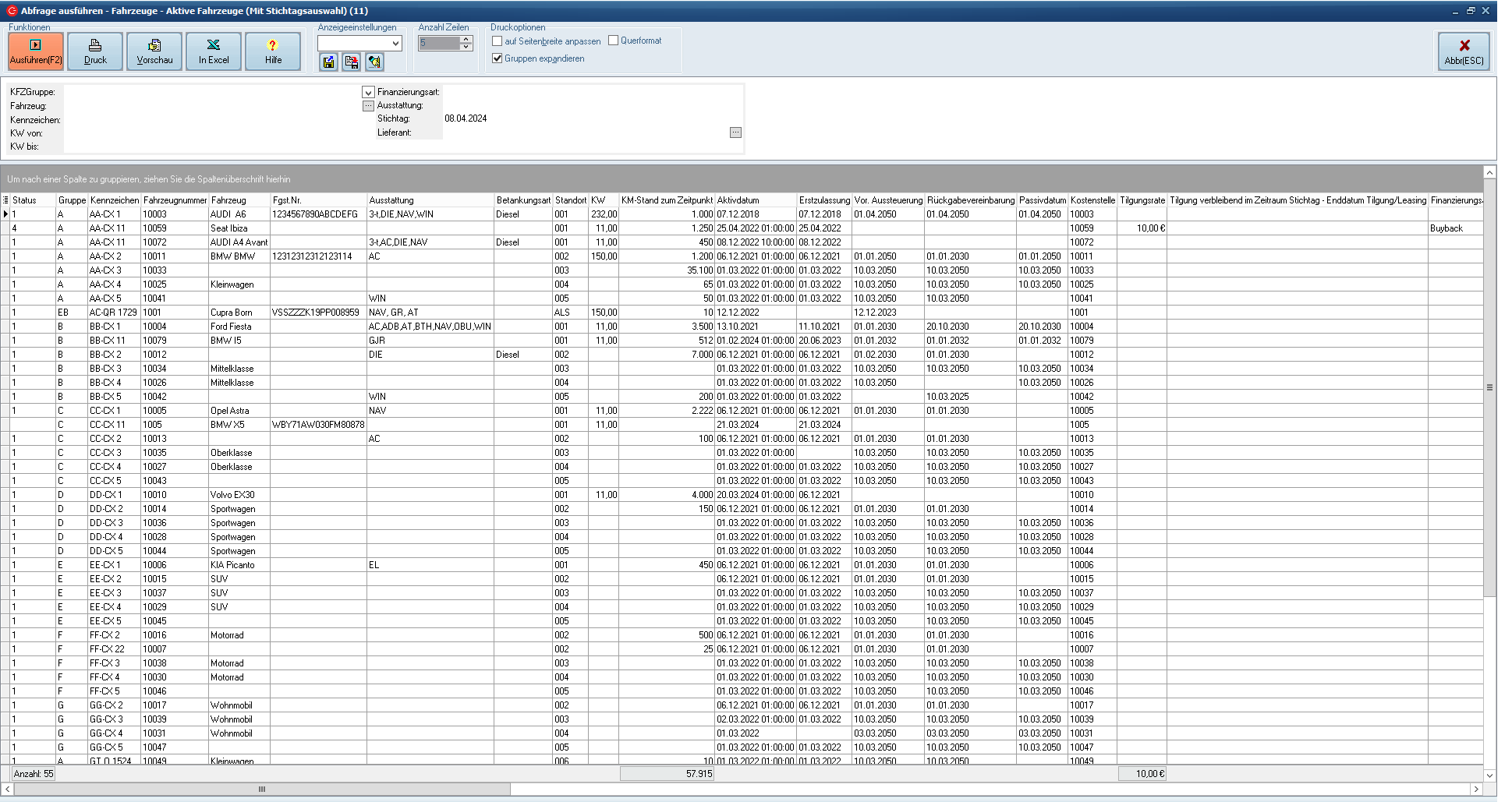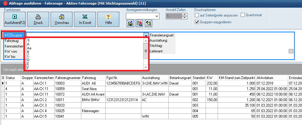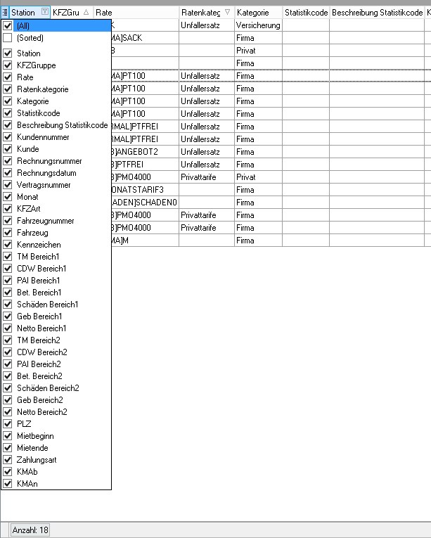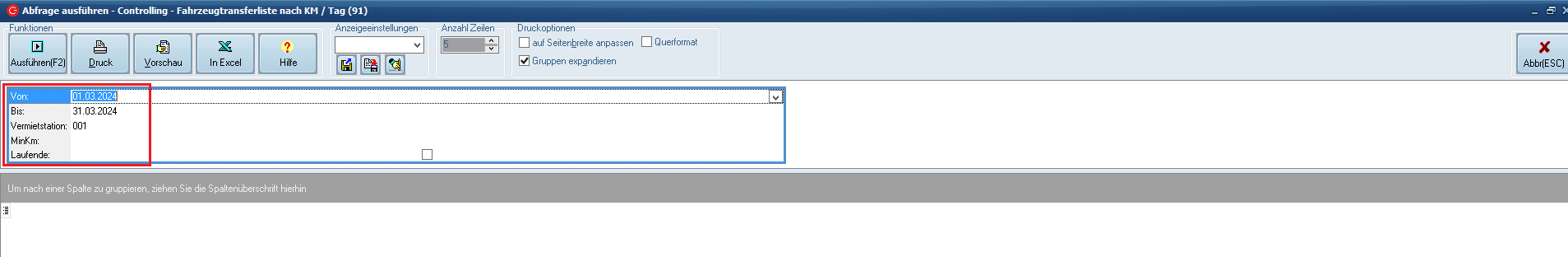 Wenn angehakt werden alle Verträge einzeln angezeigt, sonst gruppiert nach tatsächlicher KFZ-Gruppe und vermieteter Gruppe.
