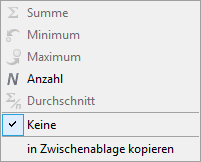 Man erhält nun eine Zeile pro vorhandenem Wert in der Spalte – hier die Gruppen A,B,C …. Die Spalte „Steuer“ wurde nach links gezogen, so dass Sie direkt sichtbar ist. Pro Gruppe erhält man so die Gesamtsumme der monatlichen Steuerbeträge. Alternativ zur Gruppensumme können noch weitere mathematische Funktionen in der Fußzeile der Gruppe angezeigt werden. Dazu klickt man mit der rechten Maustaste auf die Fußzeile bei der Spalte, bei der man eine andere Funktion wählen will und erhält einen Auswahldialog: