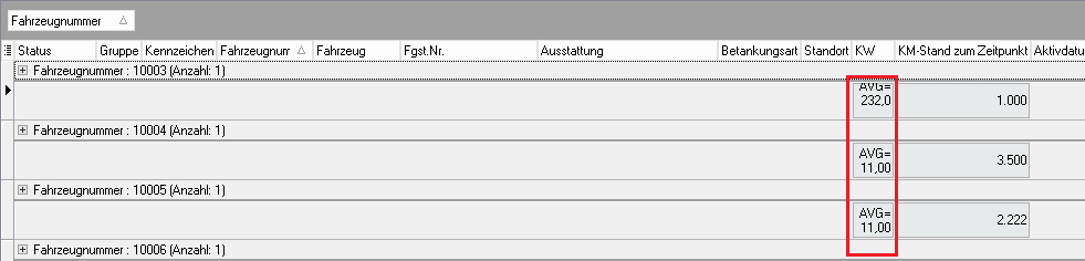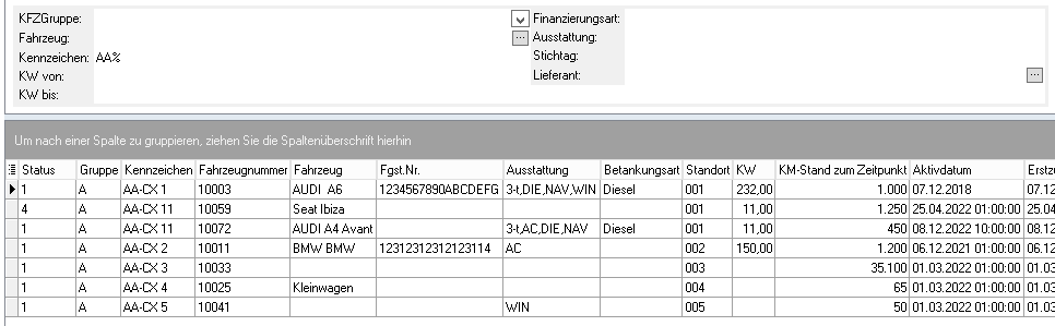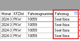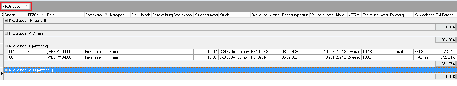 Über das „Ziehen“ von Spalten in den grauen Bereich oberhalb der Spaltenüberschriften kann man eine Gruppierung anhand der in dieser Spalte vorhandenen Werte durchführen – im Beispiel die Fahrzeuggruppe: