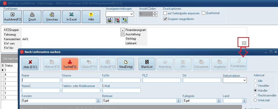 Dieses betrifft die Parameter mit den folgenden Namen : KUNDENNUMMER, KUNDENNUMMER VON, VERMITTLERNUMMER, KUNDENKATEGORIE, MITARBEITER, BETREUER, HÄNDLERNUMMER, LIEFERANT, FAHRZEUG: