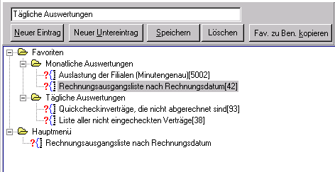 In die Favoriten können Auswertungen aus dem rechten Bereich mithilfe von Drag and Drop gezogen werden um häufig genutzte Auswertungen schneller finden zu können oder andere Bezeichnungen und Gruppierungen zu erstellen. Hierzu können individuelle Einträge erstellt und neue Namen für die Auswertungen vergeben werden. Beispielsweise könnten Auswertungen nach Ihren Aufrufzeitpunkten gruppiert werden: