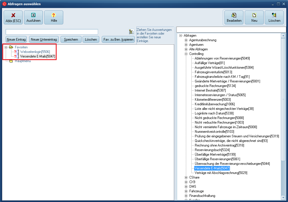 Der Bereich der Auswertungen ist im Hauptmenü von C-Rent unter dem Punkt Abfragen zu finden: