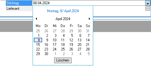 Bei den Datumsfeldern kann das Datum manuell durch Eingabe in der Form TTMMJJ eingeben werden oder über einen Kalender ausgewählt werden, den man über einen Klick auf den Pfeil neben dem Datumsfeld erhalten kann: