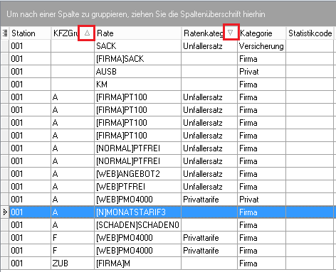 Es kann über mehrere Spalten sortiert werden, indem man die Überschriften in der gewünschten Reihenfolge mit gleichzeitig gedrückter Umschalttaste (Großschreiben) anklickt. In diesem Beispiel zuerst die Gruppe aufsteigend, die Fahrzeugbeschreibung absteigend: