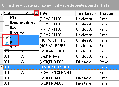 Beim Überfahren einer Spaltenüberschrift mit der Maus erscheint im rechten Bereich der Spalte ein Drop-Down Pfeil. Durch einen Klick auf den Pfeil wird eine Liste mit allen in der Tabelle vorhandenen Werten angezeigt. Die anzuzeigenden Werte können über die Häkchen ausgewählt werden, im Beispiel die Gruppen A und F: