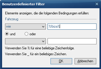 Hier kann man individuelle Filter zu einer Spalte einstellen wie in diesem Fall z.B. der Filter nach allen Fahrzeugbezeichnungen in denen „Ibiza“ vorkommt: