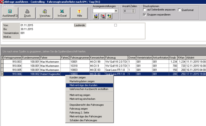Diese Abfrage wird genutzt um Verträge zu finden, bei denen eine bestimmte Kilometerleistung überschritten wurde oder der Umsatz/Tag unter