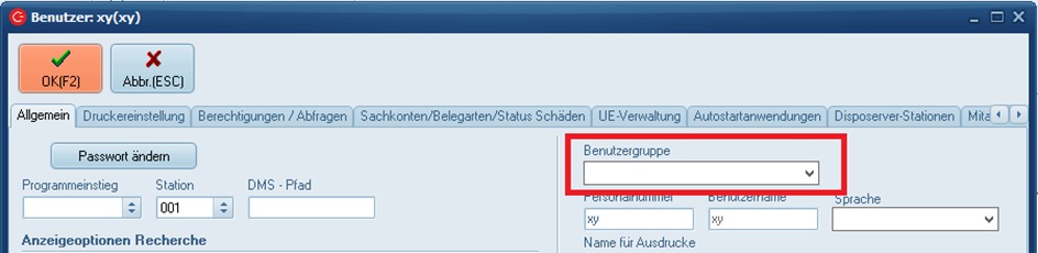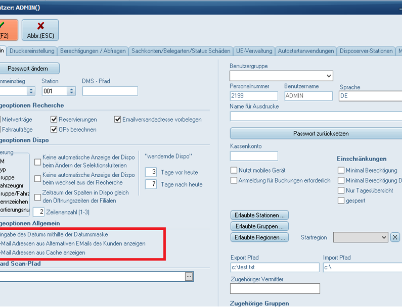 Erlaubte Stationen, diese Einstellung ist wichtig, um vom Benutzer angelegte Stationen in der Disposition anzeigen zu lassen. Wenn eine neu angelegte Station hier nicht für den Benutzer freigegeben wurde, wird diese nicht angezeigt.