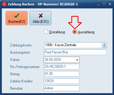 Im sich nun öffnenden Buchungsfenster ist bereits die Differenz aufgeführt sowie der Marker auf "Auszahlung" gesetzt. Sie brauchen nur noch mit einem Klick auf "Buchen" oder dem Betätigen der Funktionstaste F2 zu bestätigen.