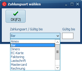 Klicken Sie nun auf "Zahlung" oder betätigen die Funktionstaste F5 auf Ihrer Tastatur. Bestätigen Sie die Auswahl der Zahlart mit ok.