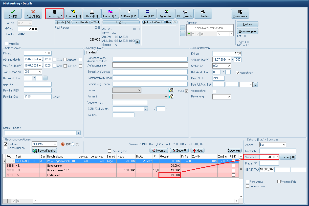 Bei folgendem Beispiel wurde für eine Anmietung eine Vorauszahlung von 200,00 € eingezahlt. Der Endpreis für die Anmietung beträgt allerdings nur 119,00 €.