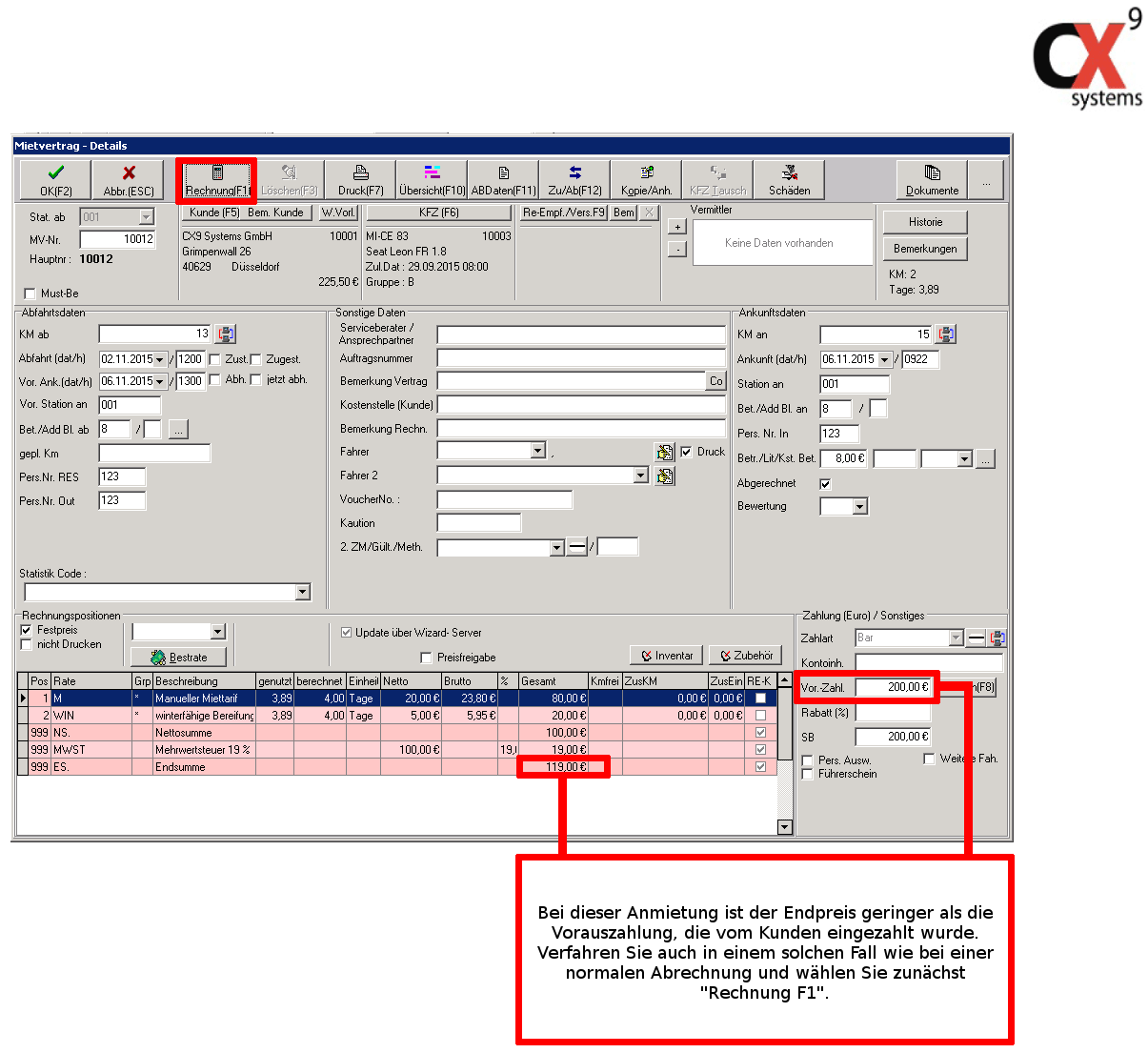 Bei folgendem Beispiel wurde für eine Anmietung eine Vorauszahlung von 200 € eingezahlt. Der Endpreis für die Anmietung beträgt allerdings nur 119 € (siehe Abb.1).
