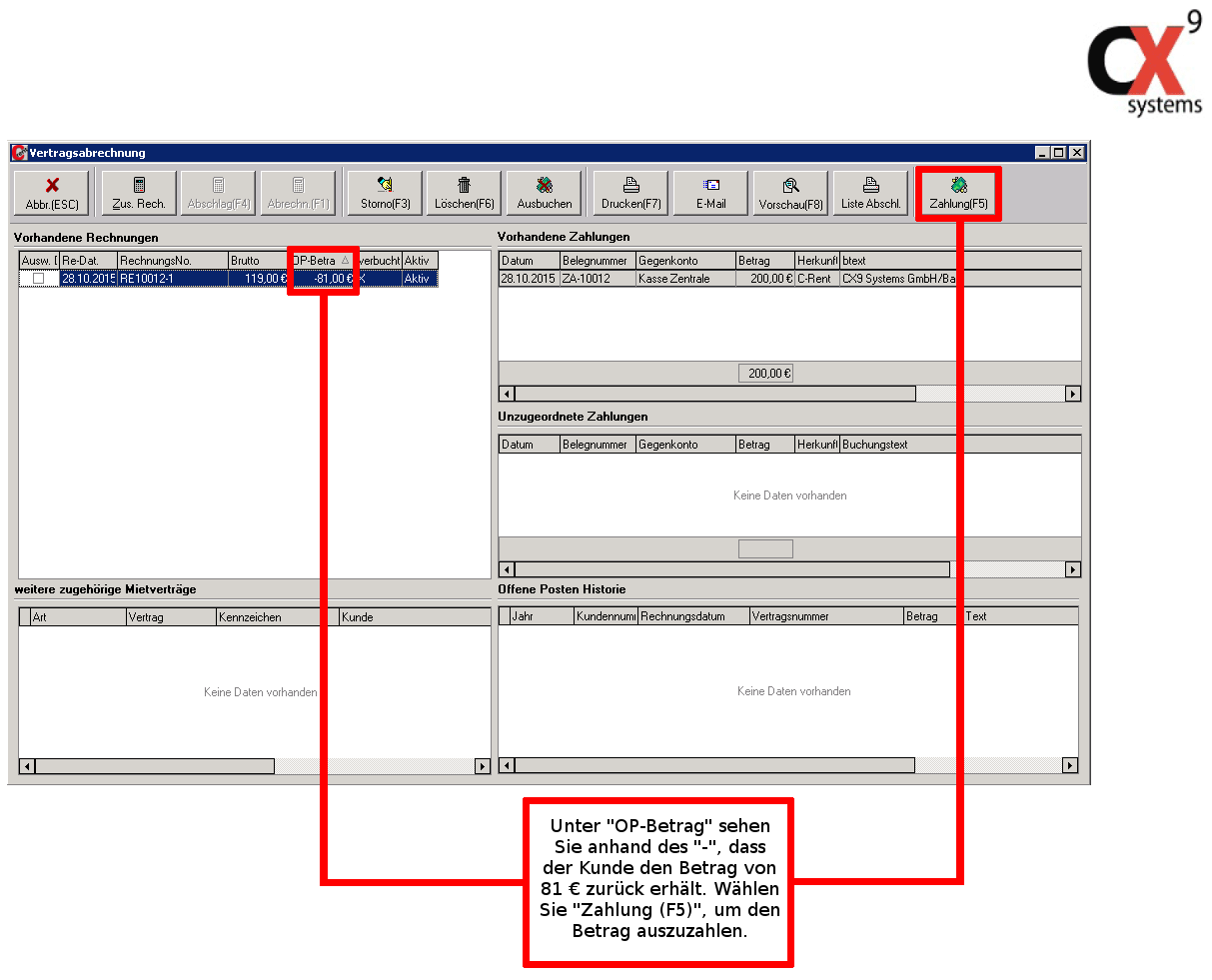 Wenn nun dieser Vertrag abgerechnet wird, erscheint unter "Vorhandene Rechnungen" die von uns angelegte Rechnung mit dem Vermerk (unter "OP-Betrag"), dass dem Kunden die Differenz auszuzahlen ist (siehe Abb.2).