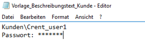 Das Kennwort kann aus der Textdatei „Connection“ kopiert und in das Feld "Kennwort" eingefügt werden, wenn man es dort vorher platziert hat, ansonsten ist es aus den C-Rent Zugangsdaten zu entnehmen.