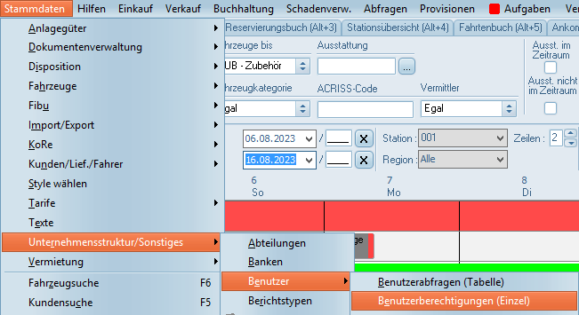 Im Hauptmenü zu Stammdaten > Unternehmensstruktur/Sonstiges > Benutzer > Benutzerberechtigungen (Einzel) wechseln.