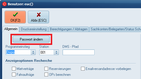 Der Benutzername wird im C-Rent bei der Einrichtung des Benutzers angelegt. Er kann z.B. aus den ersten beiden Buchstaben des Nachnamens und dem ersten Buchstaben des Vornamens bestehen „Christian Eustergerling“ => „euc“