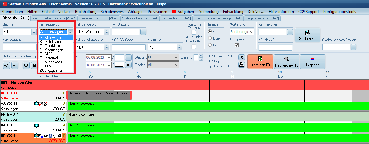 Die aktuell angezeigten Fahrzeuge in der Disposition können durch erneute Auswahl oder Eingabe von Filterkriterien erweitert oder eingeschränkt werden. Ebenso die angezeigten Gruppenreservierungen.