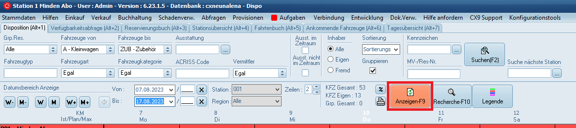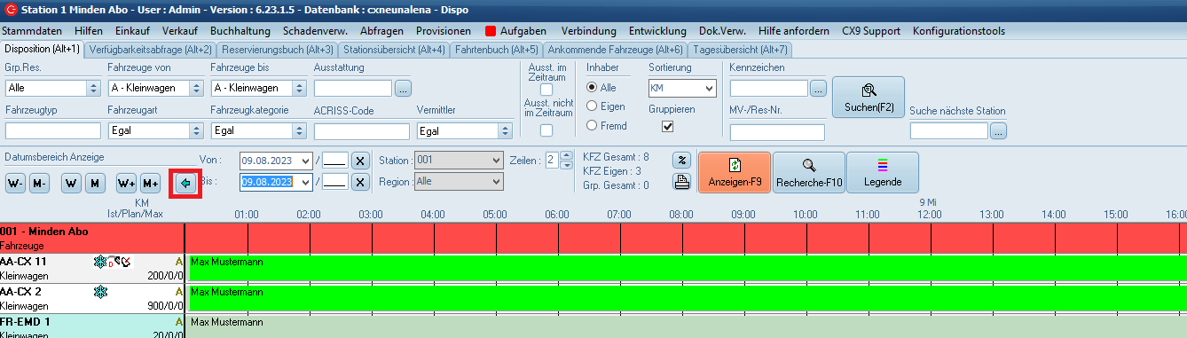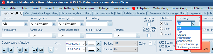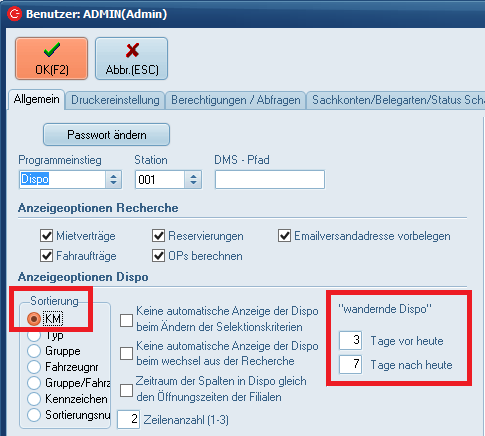 3 Tage vor heute / 7 Tage nach heute. (Diese Einstellung kann jeder Benutzer für sich selbst ändern („wandernde Dispo“). Auch die vorbelegte Sortierung (hier auf „km“), darf selbst gewählt werden.)
