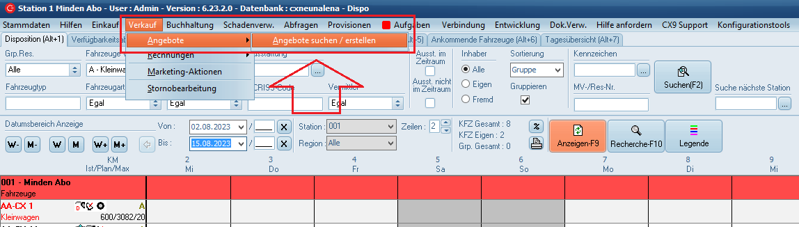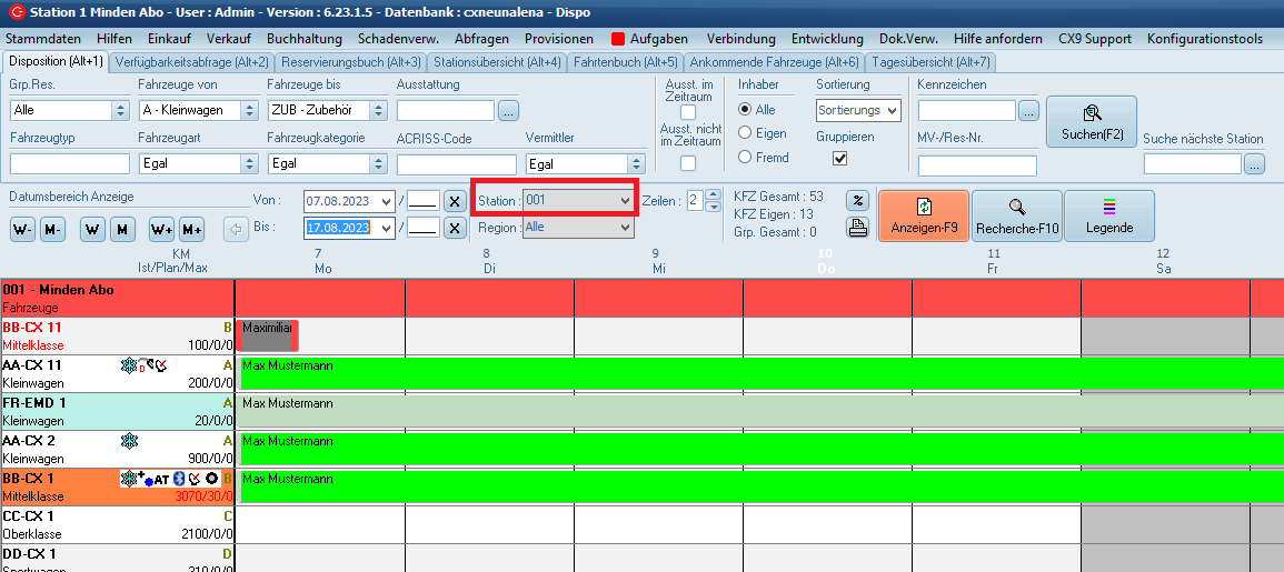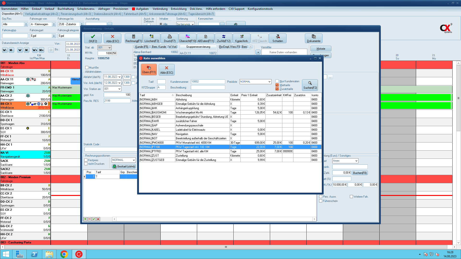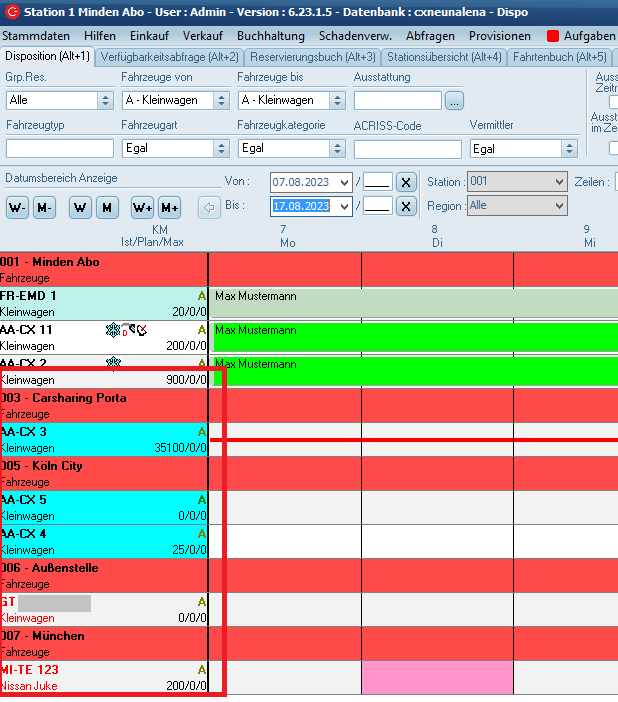 - Nach Bestätigung des geänderten Kunden mit „OK(F2)“ im Mietvertrag wird dieser jetzt auch entsprechend in der DISPO angezeigt.