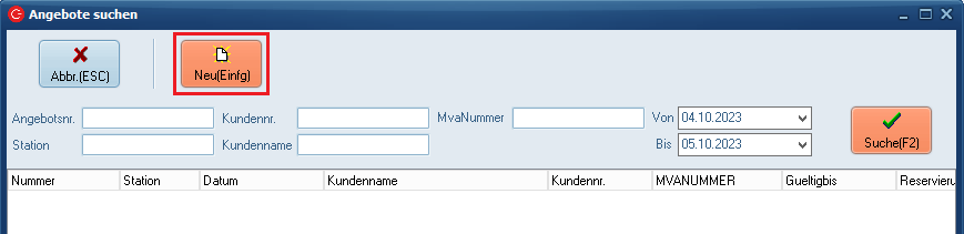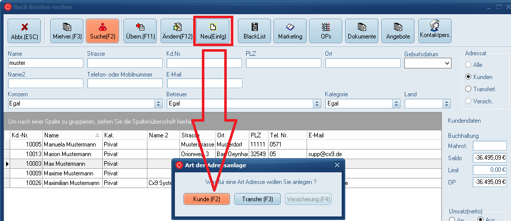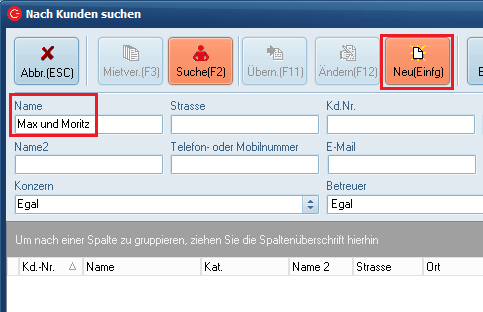 Ist der Kunde noch nicht vorhanden => so kann diese durch Klick auf „Neu“ (Einfg) angelegt werden.