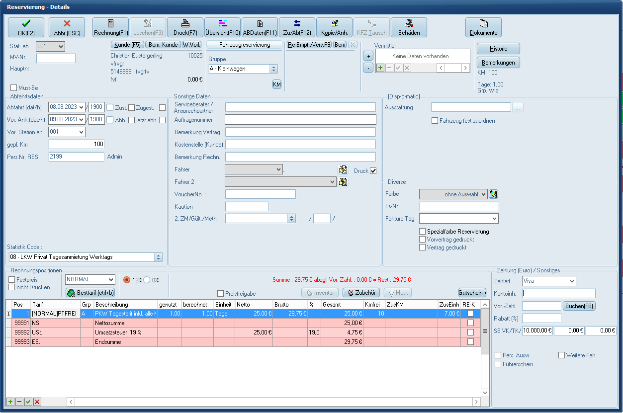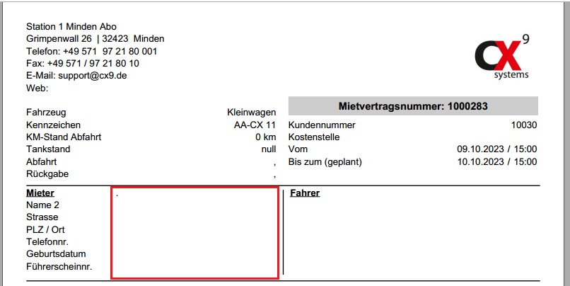 Der Vermieter fährt jetzt also mit dem ausgedruckten Mietvertrag zur Werkstatt, vermietet das Fahrzeug und trägt unter „Mieter “ händisch die Daten des Kunden ein.