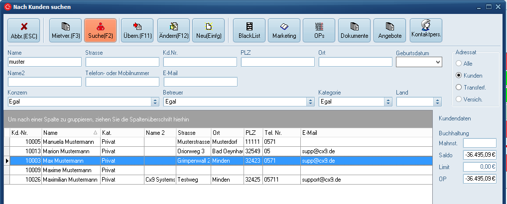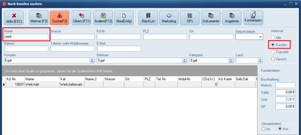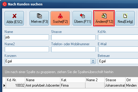 - Teiltext des gesuchten Kundennamens eingeben (wird das nicht gemacht, wird der gesamte Kundenstamm aufgerufen).