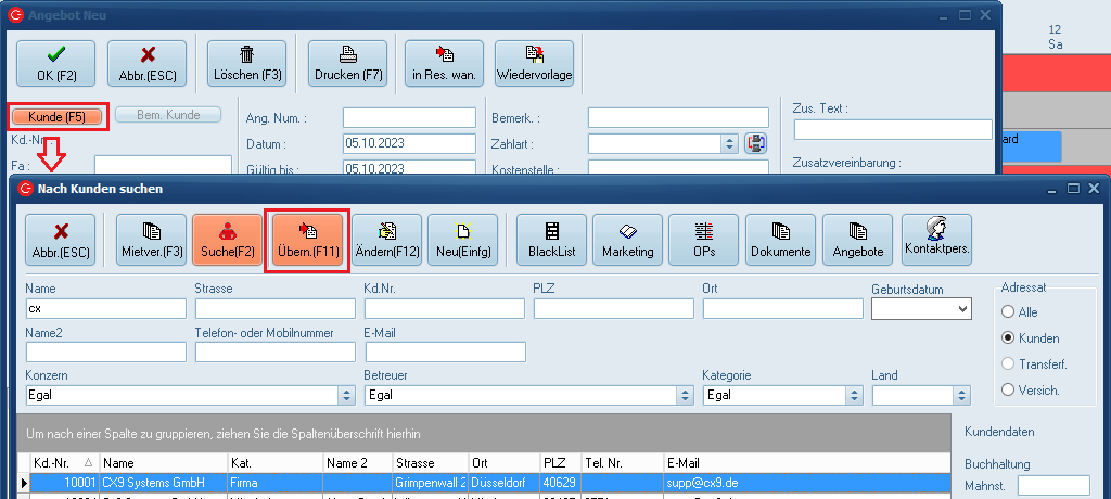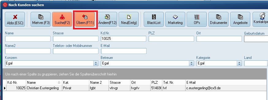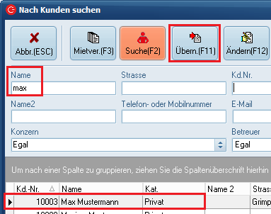 - Wurde der passende Kunde gefunden – da dieser bereits im System vorhanden war – kann dieser markiert und mit „Übern. (F11)“ als „richtiger“ Kunde für den Mietvertrag übernommen werden.