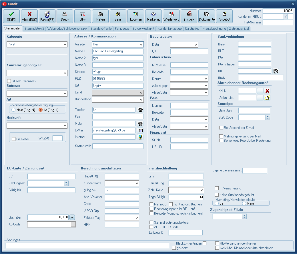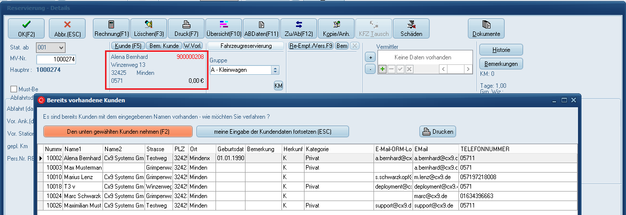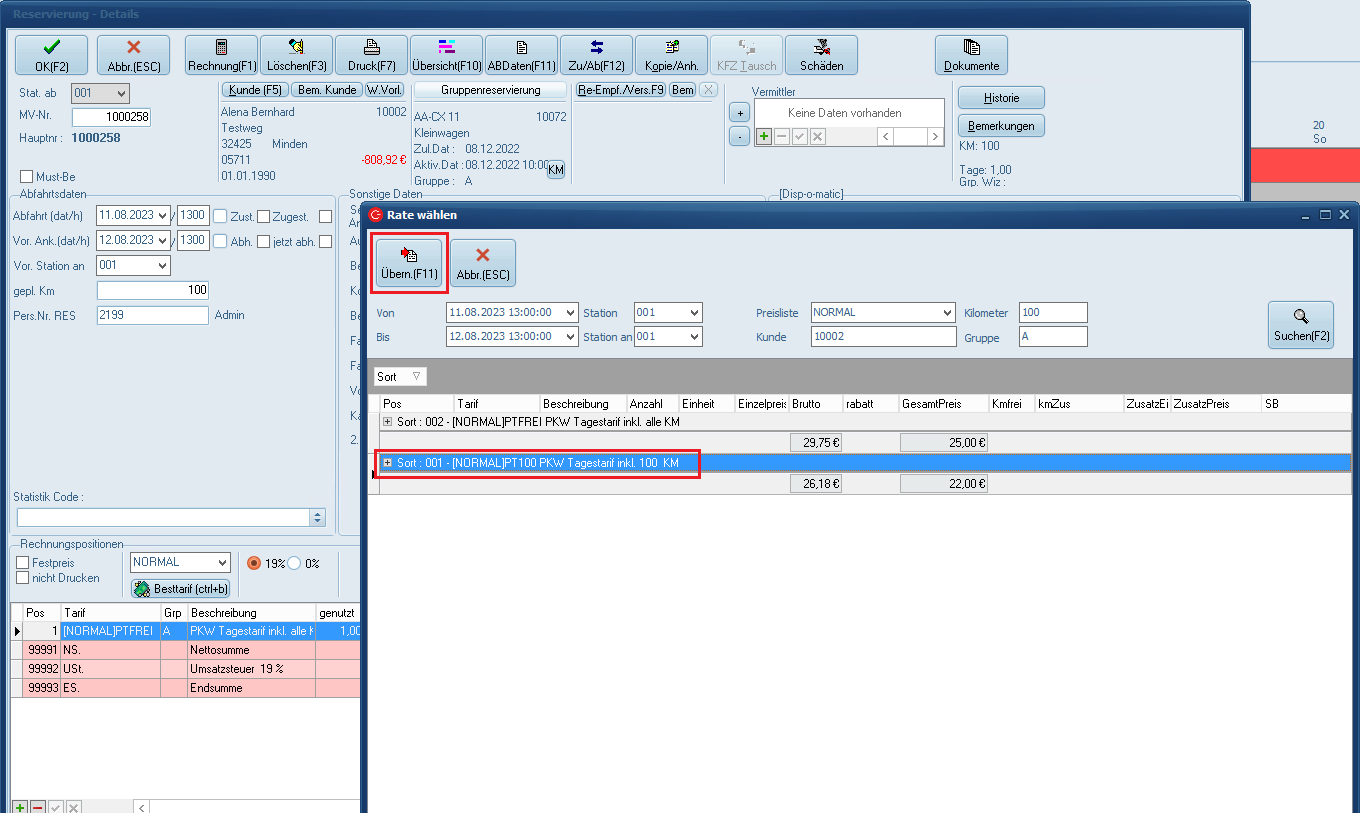 Der DUMMY-Kunde kann jetzt als Kunde ausgewählt und mit „Übern.(F11)“ in die Reservierung oder den Mietvertrag übernommen werden.