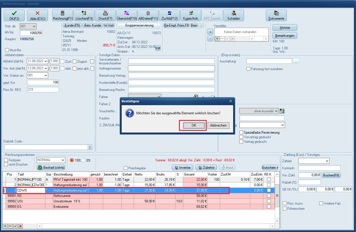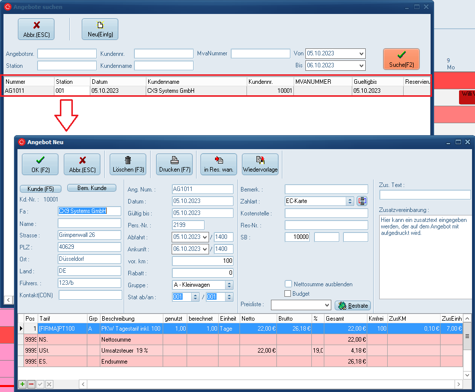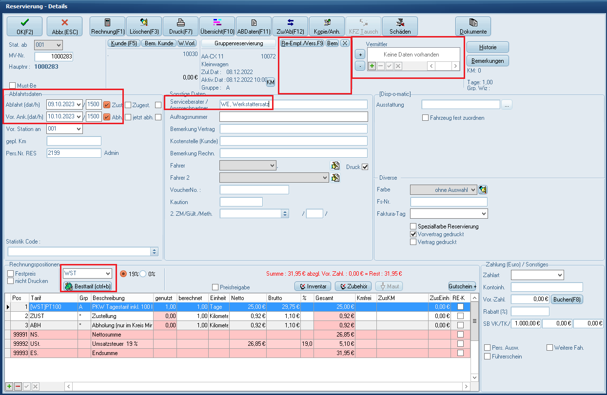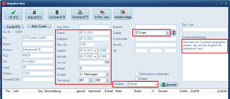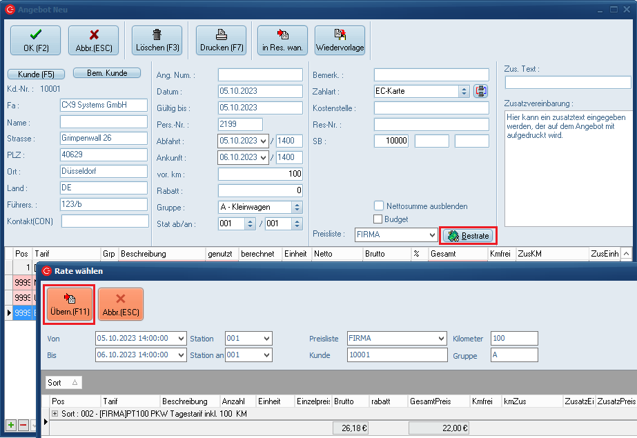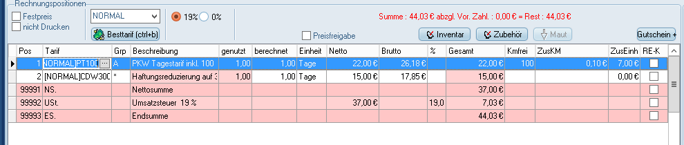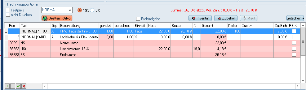 Jetzt wird der entsprechende Tarif in das Angebot, die Reservierung oder den Mietvertrag übernommen. Sind obligatorische Zusatztarife zum gewählten Miettarif hinterlegt, werden diese ebenfalls automatisch mit hinzugefügt, diese können bei Bedarf mit Strg + Entf wieder entfernt werden.