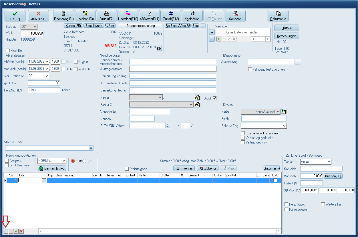 Soll die „Besttarif-Funktion“ nicht verwendet werden (manuelle Auswahl eines bestimmten Miettarifes) oder eine weiterer Zusatztarif hinzugefügt werden, klickt man auf das kleine grüne + am unteren Rand des Rechnungspositionen-Fensters oder benutzt die Taste "Einfg" um eine neue Zeile einzufügen.
