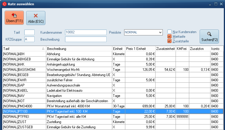 Um den besten ermittelten Miettarif zu übernehmen wird auf die Schaltfläche „Übern.(F11)“ geklickt. Um einen anderen angezeigten Miettarif zu verwenden wird der gewünschte Tarif angeklickt und dann ebenfalls mit „Übern.(F11)“ übernommen.