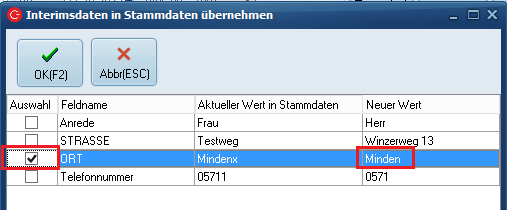 Wenn Sie einen der gewählten Kunden übernehmen können Sie zusätzlich abweichende Daten bei Bedarf aktualisieren. Im Beispiel hier wird der Ort aus den neuen Wertz übernommen, weil wir hier den entsprechenden Haken gesetzt haben: