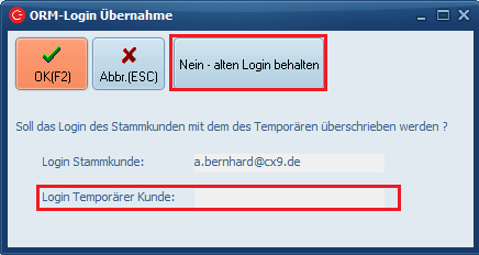 Besteht ein ORM LF Login (bei dem Temp-Kunden oder dem Stammkunden), so wird dieser ebenfalls abgefragt (in unserem BSP hat der Temp-Kunde keinen neuen Login erzeugt (erkennbar am leeren Feld) und wir behalten den Login des Stammkunden).
