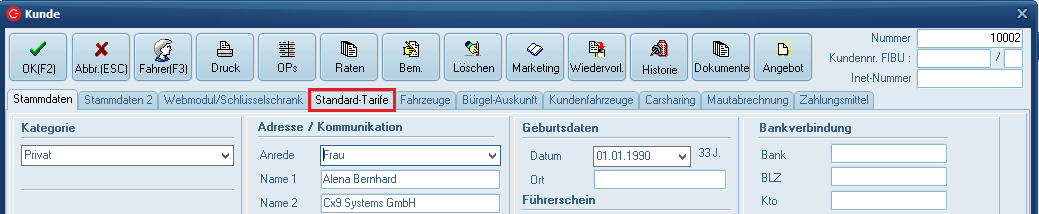 Dem Kunden kann im Kundenstamm unter dem Reiter „Standard-Tarife“ eine Preisliste zugeordnet werden. Diese wird dann bei Angebot, Reservierung und Mietvertrag für den Kunden vorausgewählt.