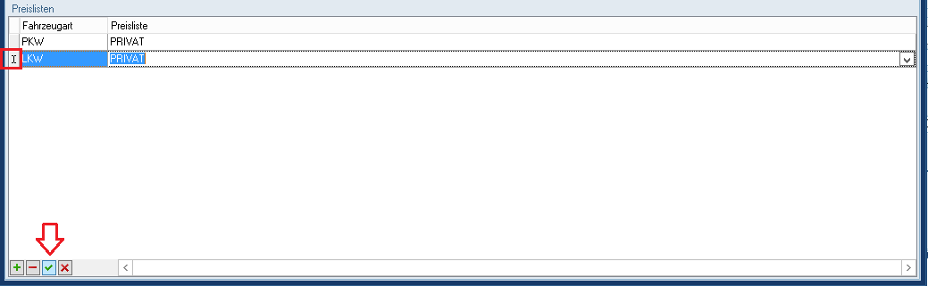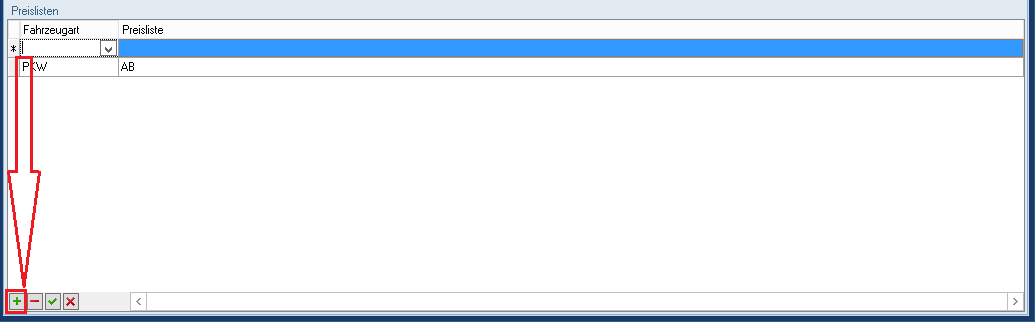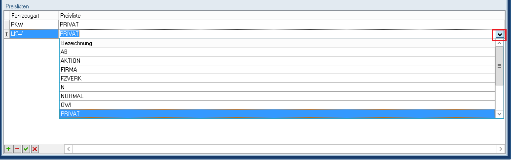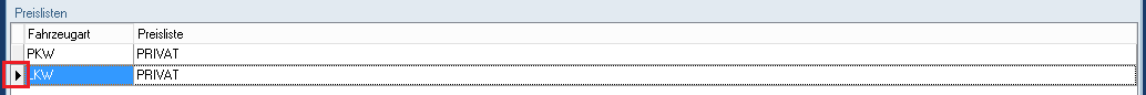 In der neu hinzugefügten Zeile muss die Fahrzeugart gewählt werden, für die die hinterlegte Preisliste gelten soll (z.B. „PKW“ oder „LKW“). Dann muss noch die zu verwendende Preisliste ausgewählt werden.