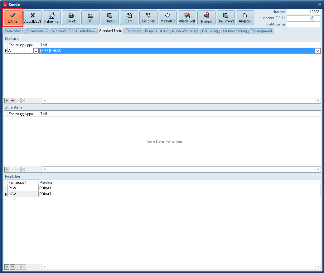 Sind alle Preisliste beim Kunden hinterlegt, hier PKW = PRIVAT und LKW = PRIVAT wird das Fenster durch Klick auf „OK(F2)“ geschlossen.