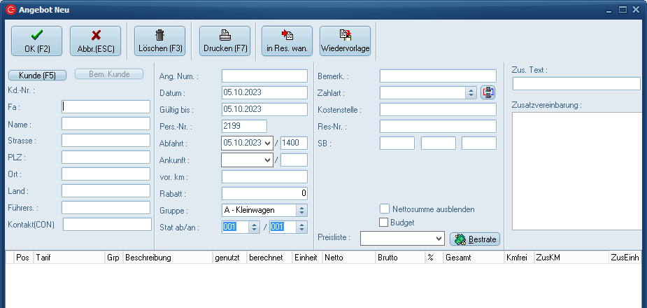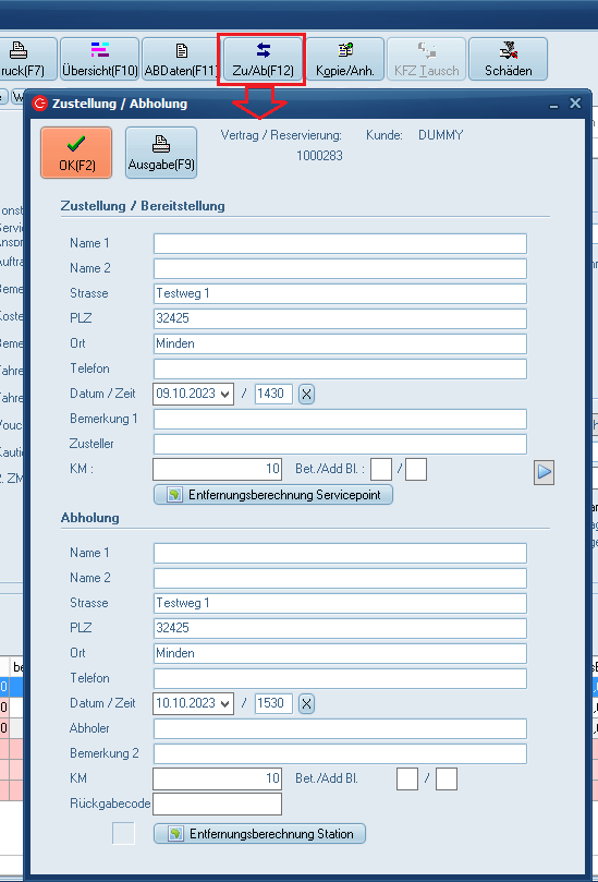 Über „Zu./Ab(F12)“ in der Reservierung oder im Mietvertrag werden Details zur Zustellung bzw. Abholung eingegeben werden.