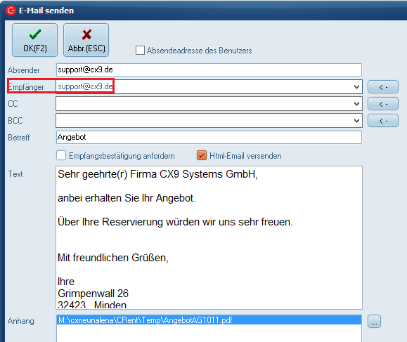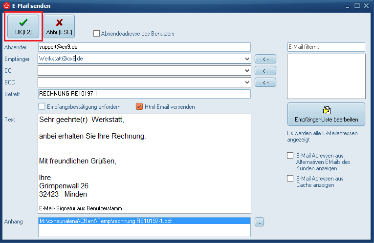 Das E-Mail Fenster öffnet sich nun. Durch den Klick auf „OK(F2)“ wird die E-Mail endgültig versendet.