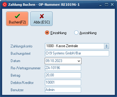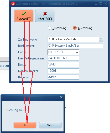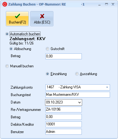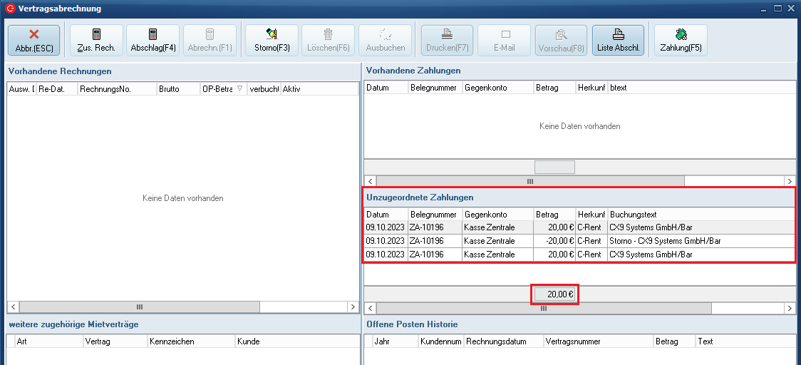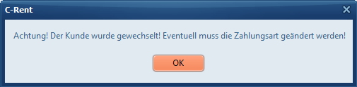 - Nach der Übernahme des „richtigen Kunden“ erscheint die Warnmeldung für die Zahlart des Mietvertrags.