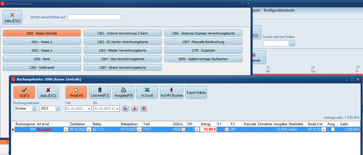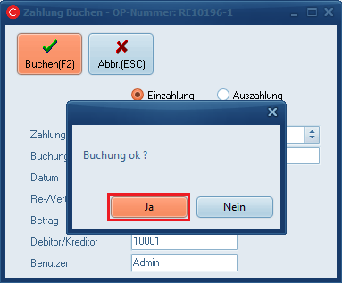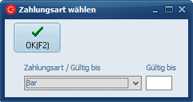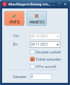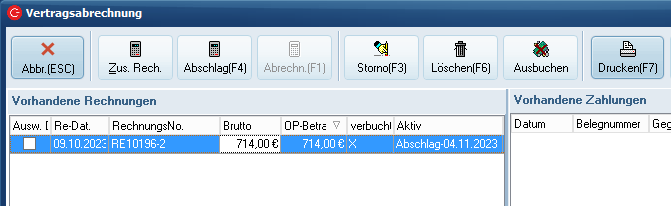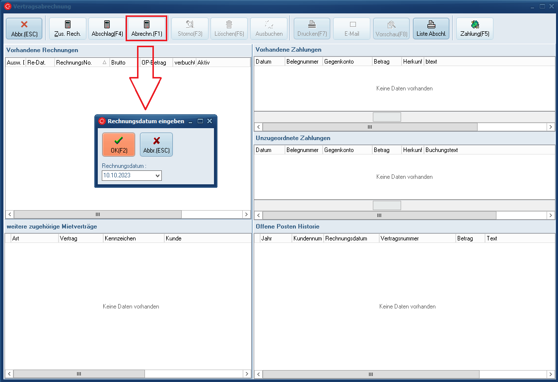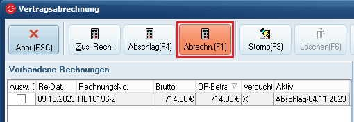 Die Rechnung wird dann mit „Abrechn.(F1)“ erstellt, das Rechnungsdatum mit Klick auf „OK(F2)“ bestätigt.
