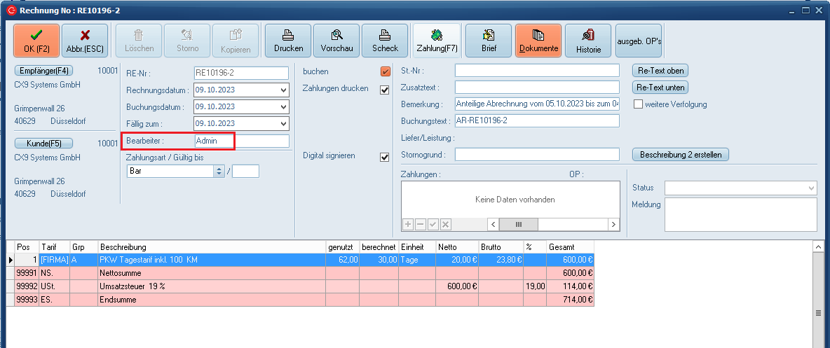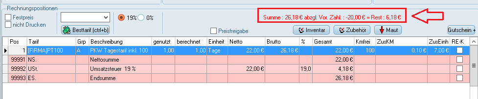 Der Dialog wird geschlossen und der markierte Tarif wird in die Rechnungspositionen übernommen.