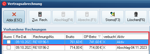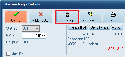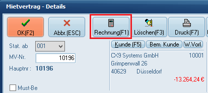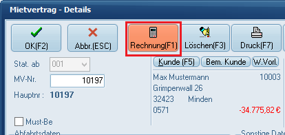 Soll dieser Mietvertrag jetzt direkt abgerechnet werden, kann das über die Schaltfläche „Rechnung(F1)“ im Mietvertrag geschehen.