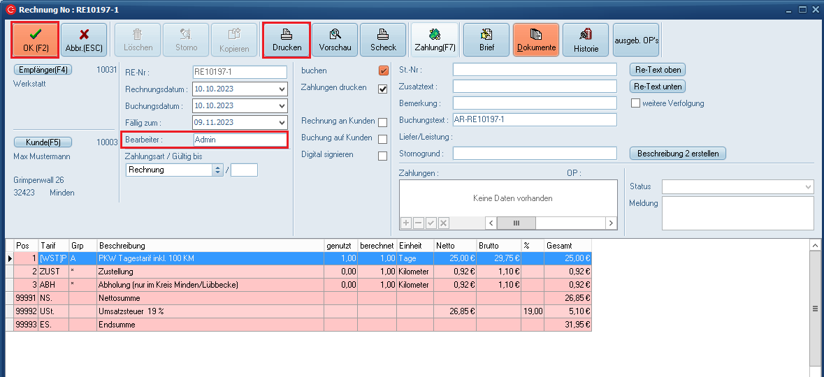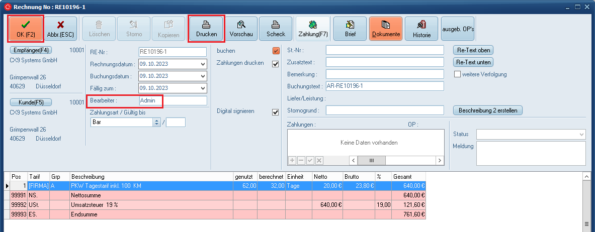 Die so generierte Rechnung kann nach Eingabe der Personalnummer des Bearbeiters durch Klick auf „Drucken“ oder „OK(F2)“ gespeichert werden.