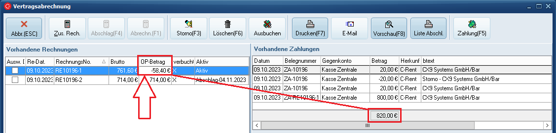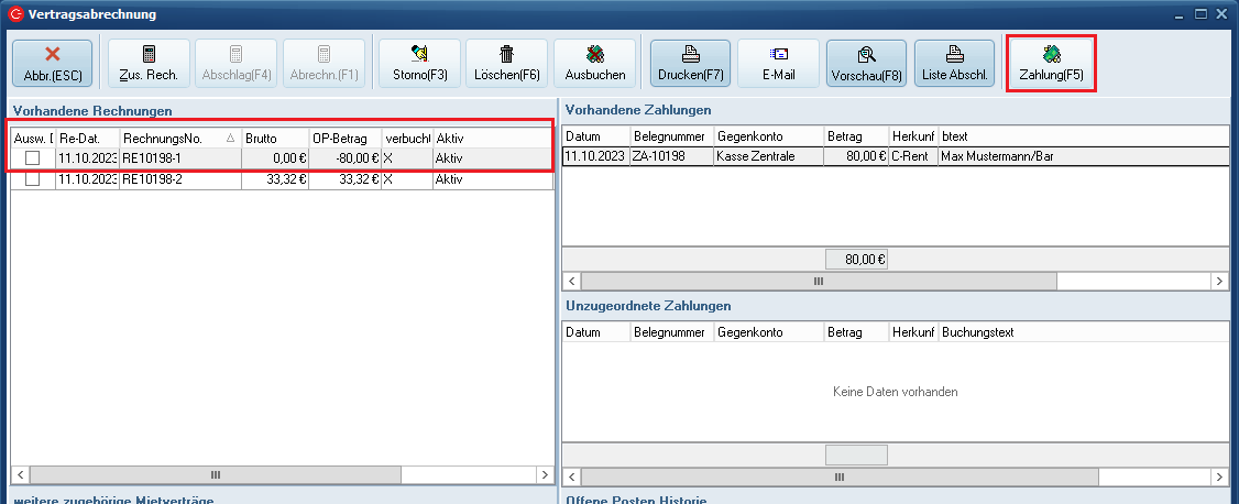 - Beim Abrechnen wird nun auch eine zweite Rechnung für den Mieter erstellt, in dem die Vorauszahlung vermerkt ist. Diese kann dann über den Zahlungsbutton ausgezahlt werden.